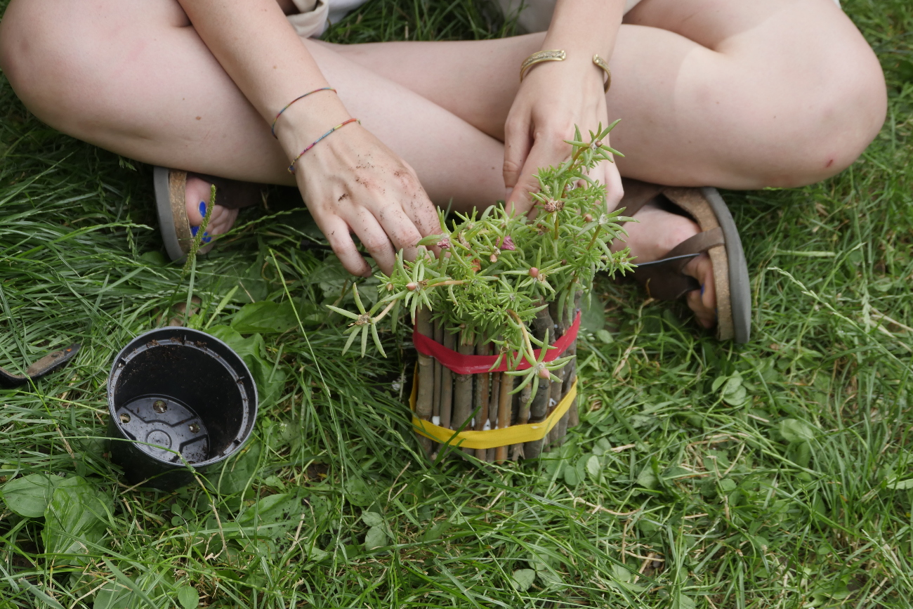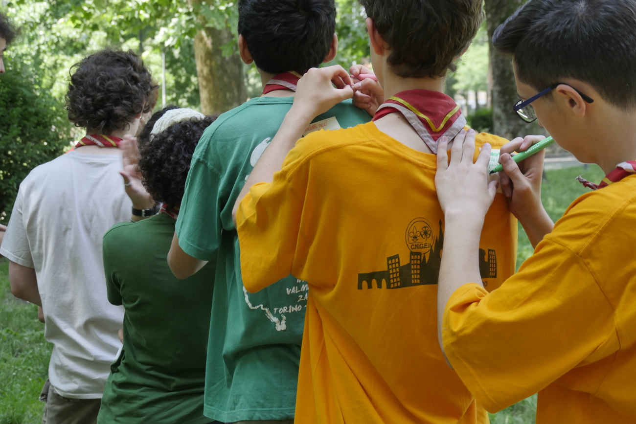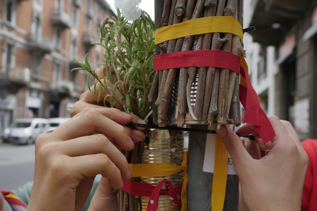 Insieme alle riflessioni i ragazzi hanno costruito i vasetti da appendere per via Padova: hanno travasato le piantine in barattoli di latta riciclati, decorati con dei legnetti e delle fettucce del colore del foulard che portano al collo, a simboleggiare la promessa scout.