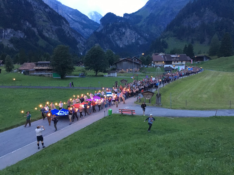Mentre eravamo a Kandersteg abbiamo partecipato anche alla festa nazionale della Svizzera, che si teneva il primo agosto. KISC aveva organizzato assieme alla cittadina di Kandersteg e varie associazioni tantissime attività che potevamo fare autonomamente di pattuglia. Noi, pattuglia lemuri, abbiamo partecipato a un’attività in cui ottenevamo un frullato pedalando e ci siamo dipinte il viso nello stand di body painting. Nel pomeriggio abbiamo partecipato a un gioco sponsorizzato da Food Kind, un’associazione che provvede alla sicurezza alimentare dei profughi. Ci siamo immedesimati nei migranti che devono affrontare numerose difficoltà per superare le frontiere e raggiungere nuove terre. Quest’attività ci ha permesso di riflettere sul tema dell’immigrazione, che già durante l’anno avevamo affrontato con il reparto. La stessa sera Food Kind aveva organizzato un barbecue di beneficienza per finanziare i propri progetti e abbiamo deciso di partecipare di reparto. E’ stato un bel momento che abbiamo condiviso con tutta l’unità e allo stesso tempo abbiamo anche fatto una buona azione! La giornata si è conclusa con una sfilata a cui hanno partecipato quasi 2000 scout presenti a Kandersteg. Abbiamo imparato nuovi bans e canzoni straniere che ancora ci suonano nella testa come i tormentoni estivi! Quando è calato il buio si sono accesi i fuochi di artificio che abbiamo potuto ammirare da vicino. Alla fine della sfilata ci hanno chiesto di riflettere sul significato di essere scout; abbiamo pensato a che cosa ci accomuna e che cosa significa portare un foulard al collo. La serata si è conclusa recitando la promessa, ogni gruppo nella propria lingua.
