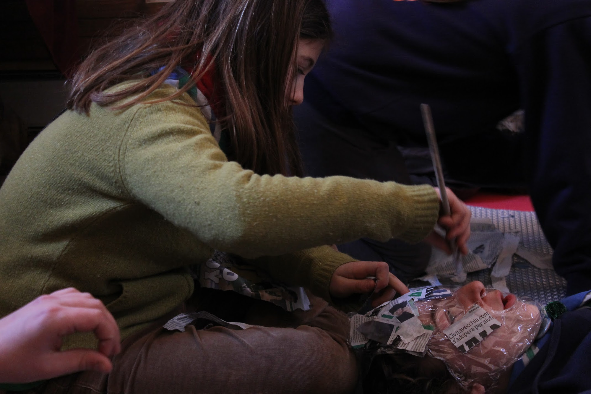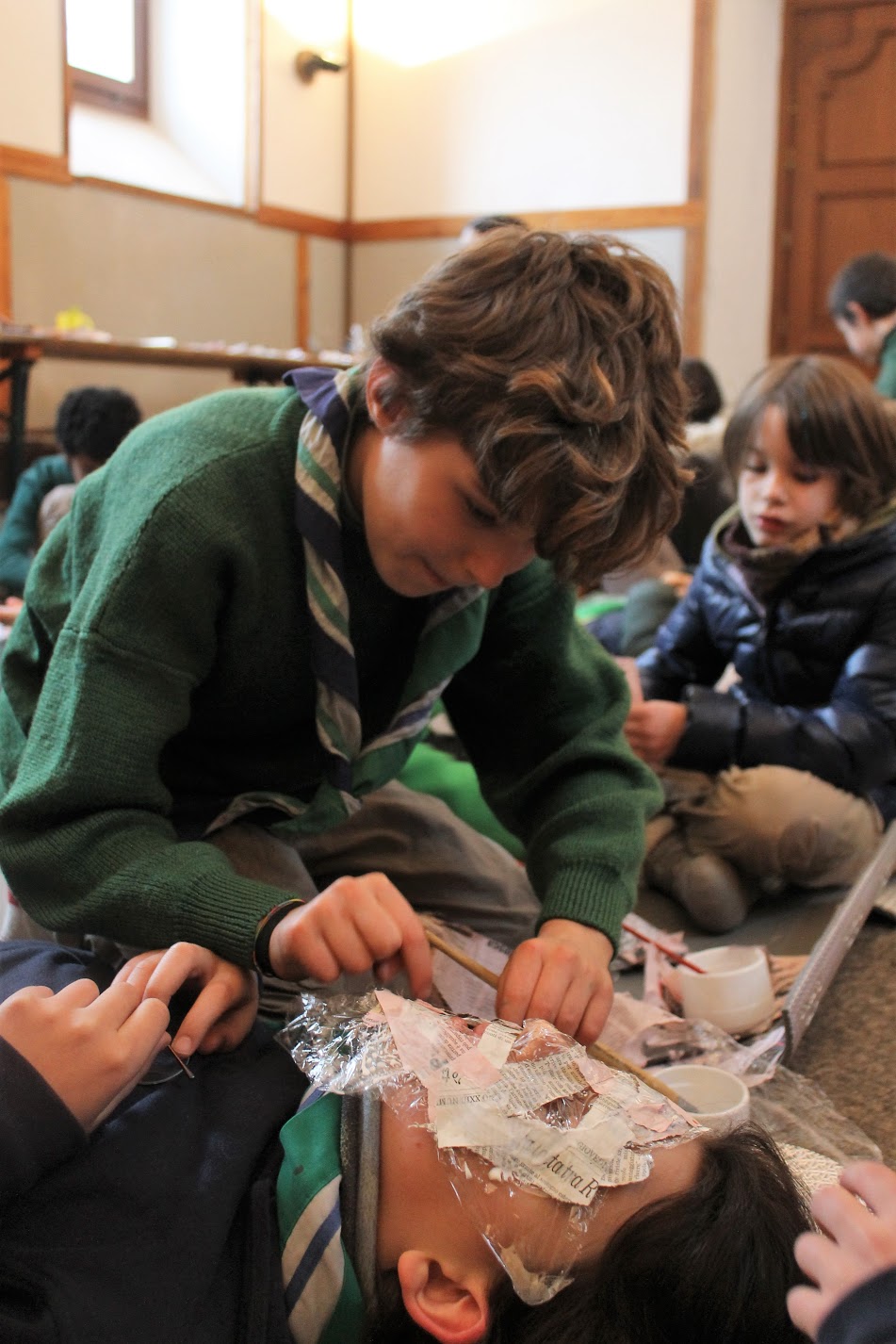 La stanza del Fuoco della vecchia casa in cima alla collina ospita tante piccole figure verdi e marroni, alcune coricate a pancia in su, altre sedute; sono i Lupetti del Secondo Branco CNGEI di Milano, pronti per un'attività carnevalesca che richiede concentrazione, lavoro di coppia e slancio creativo. Sul pavimento sono poggiati piccoli recipienti di colla vinilica diluita con Acqua e fogli di giornale sempre meno integri. I Vecchi Lupi vigilano muovendosi per la stanza e aiutando i piccoli artisti a bucherellare i pezzi di pellicola trasparente che verranno stesi sui visi dei Lupetti coricati a Terra, pronti per essere ricoperti di colla e pezzetti di giornale. All'improvviso lo scenario è fatto di mummie di carta immobili che si prestano con pazienza e fiducia all'opera degli scultori compagni di avventure, occasionalmente qualche Lupetto sfreccia come Elettricità da un punto all'altro chiedendo rifornimento di materiale; nella stanza balena un'aria leggera e un miscuglio allegro di sensazioni semplici. Tra spennellate, “è finita la colla!”, strati che si sommano, “ridammi il pennello!”, oggetti che volano in Aria, “che bella questa!”, pellicola accartocciata, trascorre il pomeriggio del primo giorno di Campo, finché ogni Lupetto ripone sul tavolo di legno la propria maschera, diversa da ogni altra per forma e dimensione, affinché si asciughi e sia pronta per essere separata dalla pellicola, ma soprattutto dipinta e personalizzata. Tutto il Branco si prepara così a concludere l'opera: viene messa a disposizione della tempera colorata e viene spiegato ad ogni Lupetto che il modo in cui le maschere dovranno essere dipinte non sarà affatto casuale. Infatti, ogni maschera dovrà rappresentare un elemento naturale e, nello specifico, quello che corrisponde al Pokémon della Muta di appartenenza; le Mute neonate sono state infatti contraddistinte proprio attraverso i Pokémon, che costituiscono, insieme ai rispettivi elementi, il tema del Capo di Carnevale. Ne fruttano maschere costellate di fiori, riempite di nuvole e cielo, altre che ritraggono fondali marini, fulmini e saette, e grandi fiamme rosse. L'attività del Branco Karela si conclude così con creature simboliche di carta colorata, stese al sole dell'ultima mattina di Campo, pronte per fare un lungo viaggio nel grande mondo della fantasia catartica del Lupetto.