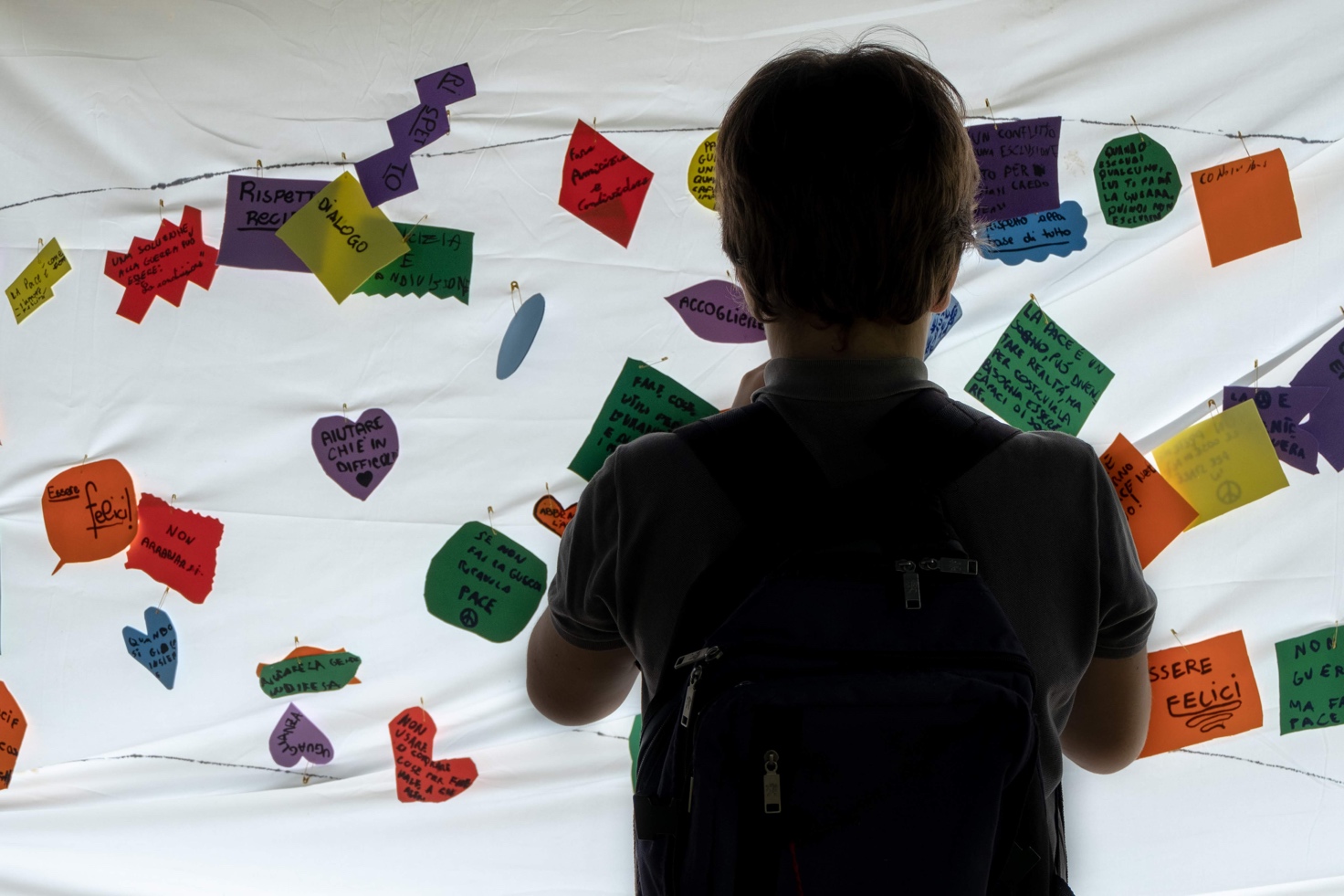 La giornata è iniziata dividendoci in gruppetti in base al colore del nastrino che avevamo al polso. I gruppi passavano da uno stand all’altro, dove si facevano diverse attività con tema la Pace.