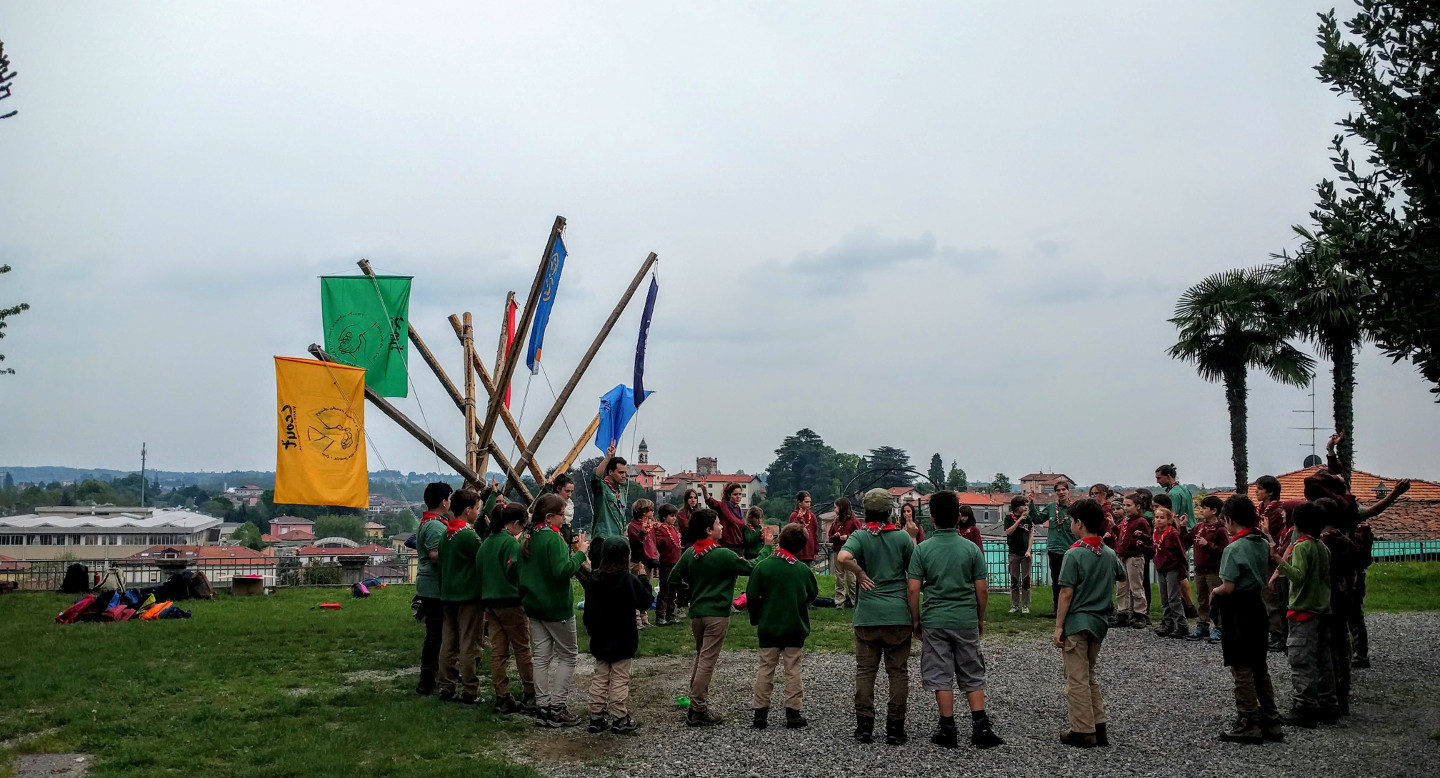 Giallo, verde, rosso, blu. I colori tradizionali dei lupetti, esploratori, rover, senior si stagliano contro il grigio nel tardo pomeriggio.
